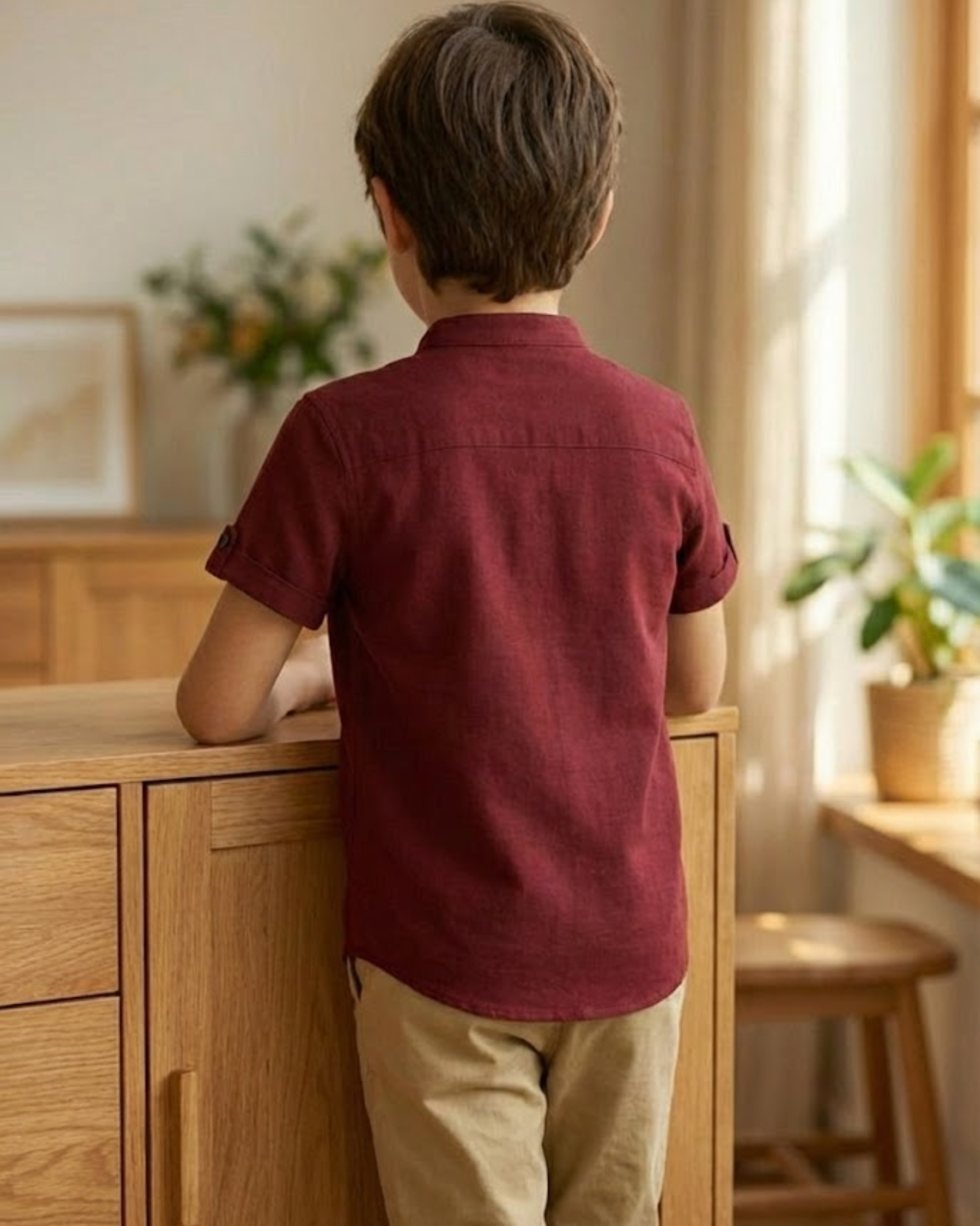 This smart casual boys’ shirt is crafted from premium polyester Cotton, ensuring durability, wrinkle resistance, and a smooth finish. The rich maroon color paired with a mandarin collar and short rolled sleeves gives it a modern, stylish vibe. Perfect for festive occasions, casual outings, or family gatherings, this shirt keeps kids looking sharp while being easy to care for.
